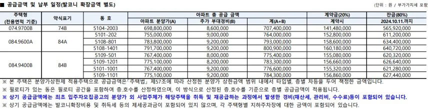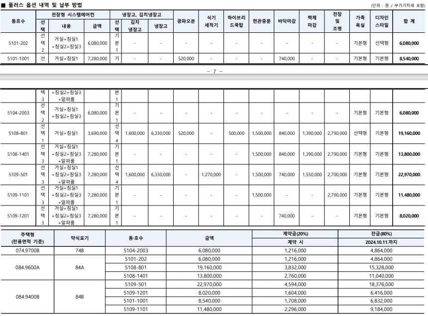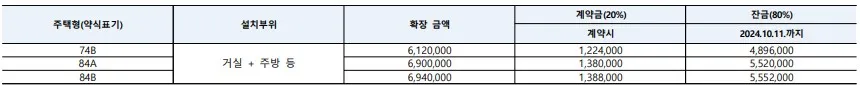 잔금 80%는 24년 10월 11일 이내에 납부하여야 합니다.잔금 납부까지의 시간이 길다고 할 수 없고, 별도의 발코니 확장비와 플러스옵션 대금이 있으니 확인하시어
